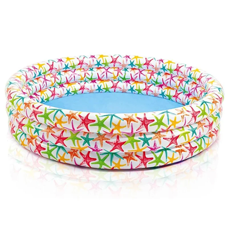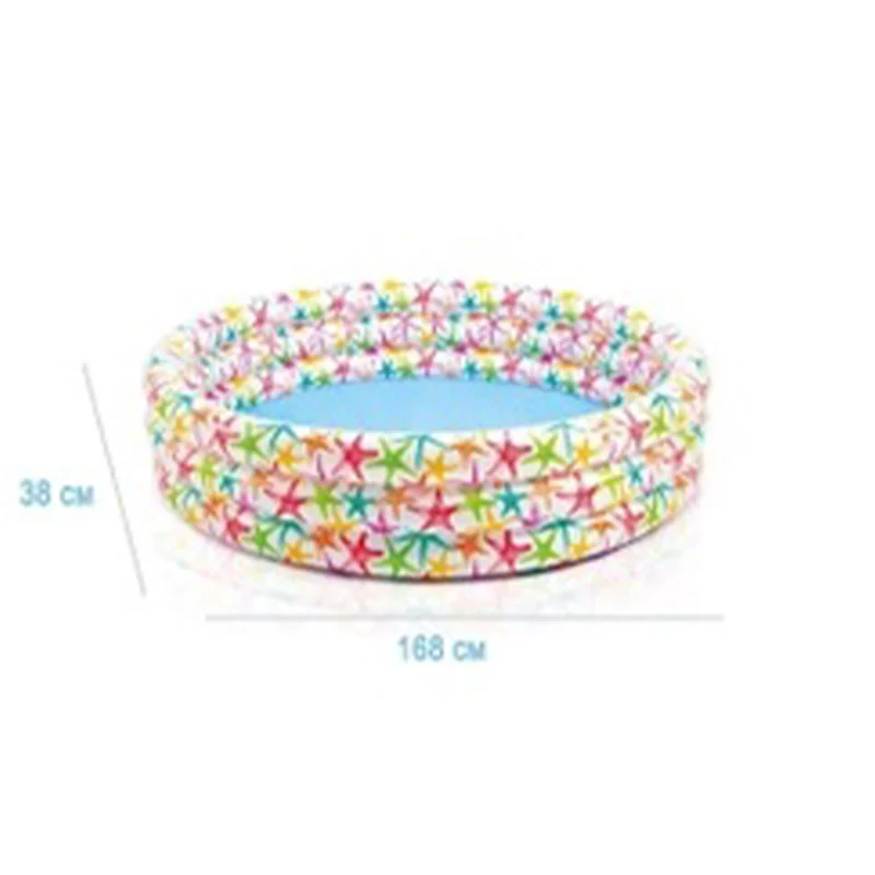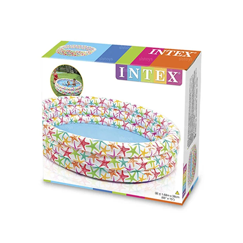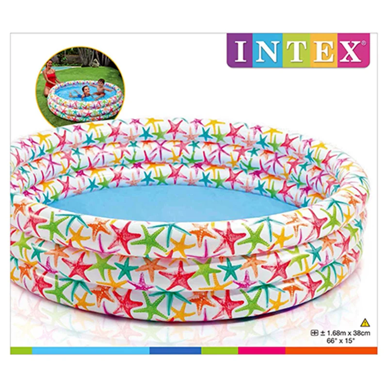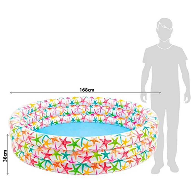 استخر بادی کودک گرد طرح ستاره دریایی intex 56440 جزو محصولات جذابی است که قطعا کودکان با در اختیار داشتن این محصول می توانند نهایت لذت را برده و به بازی و تفریح در داخل منزل و یا هر فضای دیگری بپردازند. در همین راستا باید اشاره کنیم که این استخر بادی ساختاری گرد را داراست که همانند بیشتر تولیدات شرکت اینتکس دارای یک ظاهر سه حلقه و زیبا می باشد. هر یک از حلقه ها و به عبارت دیگر لایه های این محصول بهصورت مجزا باد می شود و بر روی هر یک از این حلقه ها شما می توانید یک عدد دریچه باد را مشاهده کنید که باعث شده تا به صورت مجزا بتوانید اقدام به راه اندازی و باد کردن محصول نمایید. علاوه بر این ها باید اشاره داشته باشیم که بر روی بده اصلی این استخر نیز شما می توانید طرح انواع ستاره های دریایی با رنگ های شاد و جذاب را هم مشاهده کنید که باعث زیباتر شدن این محصول گردیده است.
