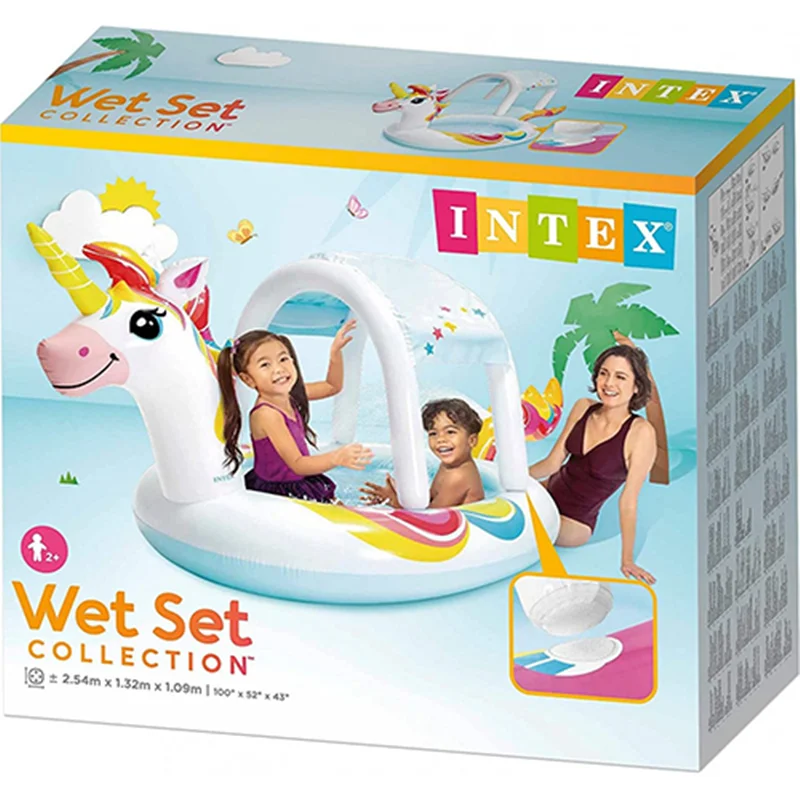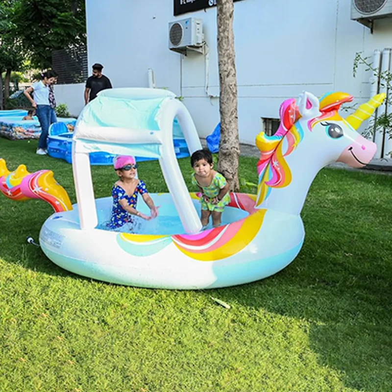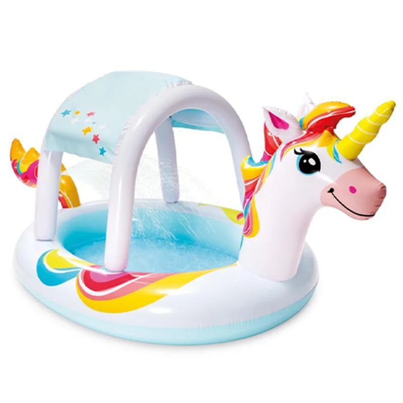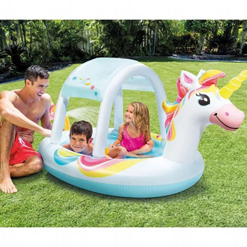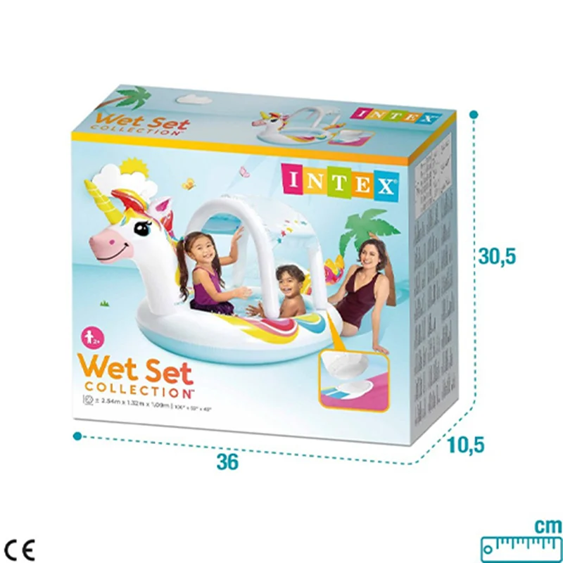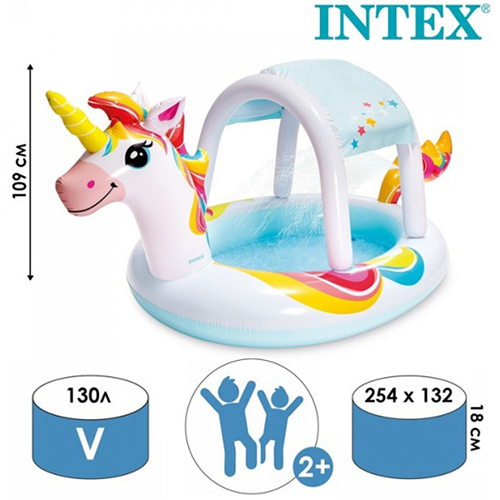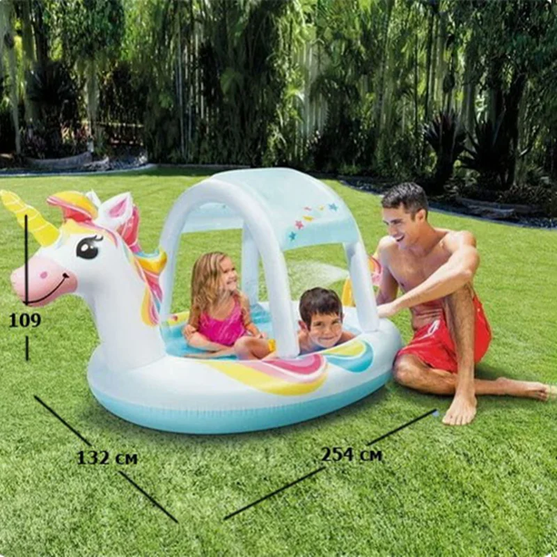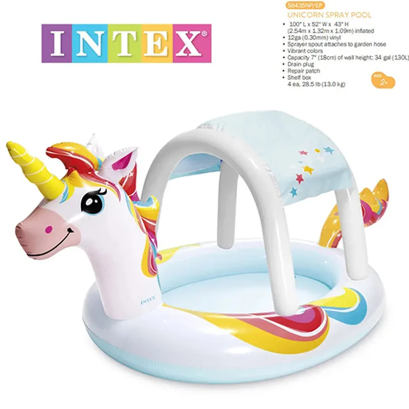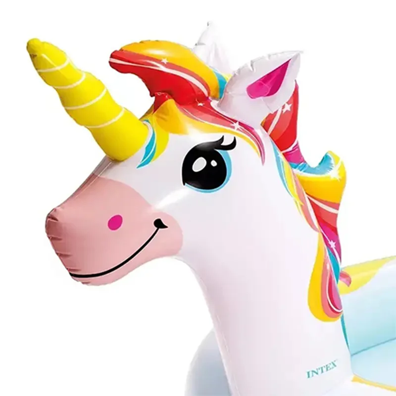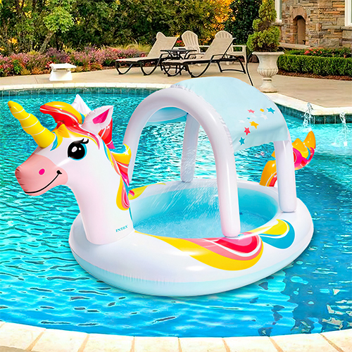 استخر بادی کودک یونیکورن اینتکس جدید یکی دیگر از زیباترین انواع استخر بادی برای رده سنی بالاتر از 2 سال بوده که به دلیل طراحی ظاهری زیبایی که داشته برای دختران از جذابیت بالایی برخوردار بوده و توسط کارخانه اینتکس در سال 2022 طراحی و تولید شده است. بدنه اصلی این استخر بادی کودک اینتکس برگرفته از اسب تک شاخ و یا همان یونیکورن بوده که برای کودکان جذابیت بالایی دارد. در بخش انتهایی این اسب تک شاخ یک آبپاش بادی سرخود تعبیه شده تا با اتصال به شلنگ آب بتواند آب را به داخل مخزن استخر بادی کودک یونیکورن اینتکس جدید هدایت کند. جنس بدنه این استخر بادی از نوع وینیل پی وی سی بوده تا محصول سازگار با تمامی شرایط آب و هوایی شده و بتوانید با دماهای مختلف آب از آن استفاده کرده تا کودک لذت ببرد. همچنین در داخل باکس محصول یک برچسب تعمیرات نیز وجود داشته تا در صورت بروز آسیب ناشی از استفاده نادرست بتوانید رویه محصول را رفوه کنید.