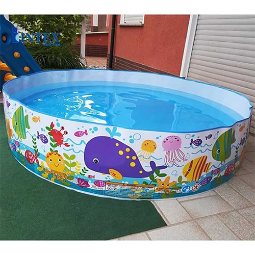 استخر طلقی کودک قطر 183 اینتکس intex 56452 هم یکی دیگر از سری استخرهایی است که با پلاستیک طلقی منعطف طراحی و تولید شده و کیفیت بسیار بالایی را هم از خود به جای گذاشته است. شما می توانید مشاهده کنید که این محصول همان طور که از ظاهرش هم پیداست یک بسته بندی کوچک دارد که به ساده ترین شکل ممکن می توانید آن را باز کرده و راه اندازی نمایید. در واقع برای راه اندازی و استفاده از این استخر دیگر نیاز به تهیه پمپ باد و یا هیچ وسیله دیگری نخواهید داشت و همین امر نیز از دیگر ویژگی های جذاب این محصول به شمار می رود. باید عنوان کنیم که به ساده ترین شکل ممکن امکان باز کردن بدنه اصلی این محصول و سپس راه اندازی و شکل دادن آن وجود دارد. نکته مهم دیگر در خصوص این محصول ضخامت بالای این بدنه است که سبب شده تا امکان آسیب دیدن آن در برابر ضربه های احتمالی بسیار کم شود و همین امر هم نقطه قوت این استخر به شمار می رود.