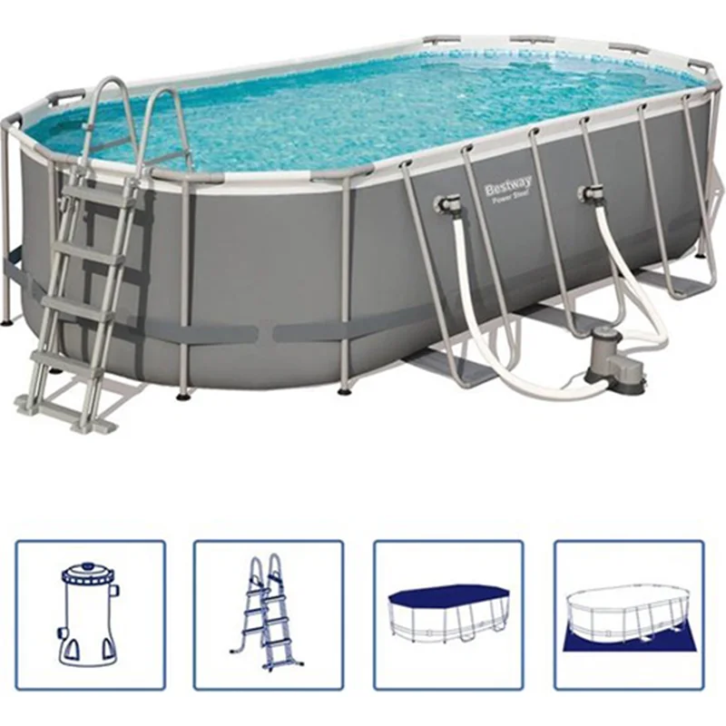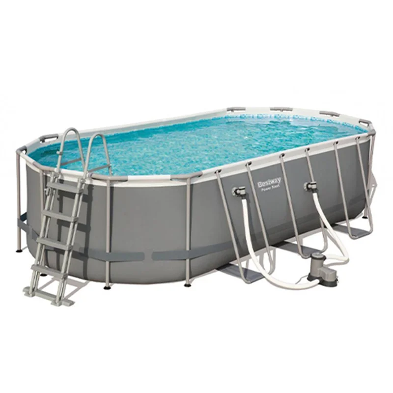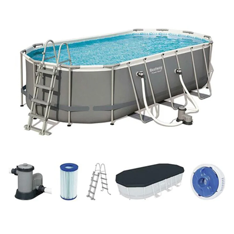 استخر پیش ساخته 274*549 بست وی Bestway 56710 یکی دیگر از جدیدترین انواع استخر پیش ساخته برزنتی بوده که با قابلیت نصب و راه اندازی به صورت روکار و توکار توسط کارخانه بست وی طراحی و با ساختاری استاندارد و قیمتی مقرون به صرفه روانه بازار می شود. این استخر پیش ساخته برخلاف اغلب نمونه های موجود در بازار ساختاری بیضی شکل داشته و بدنه اصلی آن از دو بخش سازه های نگهدارنده و مخزن اصلی ایجاد شده است. در داخل بسته بندی این استخر پیش ساخته یک عدد پمپ تصفیه آب فیلتری سایز بزرگ وجود داشته تا شما بتوانید با اتصال آن به مخزن اصلی محصول به تصفیه اب داخل استخر پرداخته و دیگر نیاز به تعداد دفعات بالا جهت تعویض آب داخل استخر پیش ساخته احساس نشود.