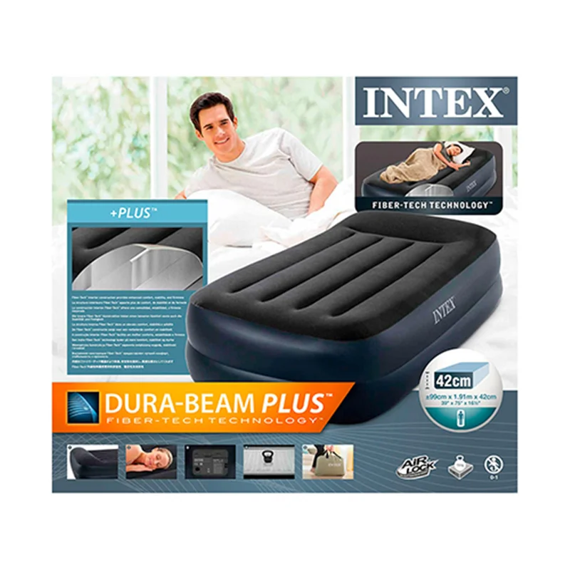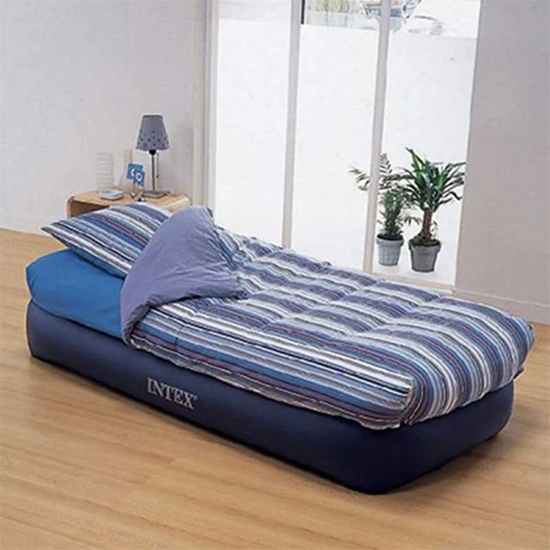 تخت خواب بادی یک نفره intex 64122 یکی دیگر از باکیفیت ترین انواع تخت بادی اصل اینتکس برای استفاده رده سنی بزرگسال بوده که با ساختاری استاندارد و طبی طراحی و با قیمتی مناسب روانه بازار شده است. این تخت بادی ساختاری مستطیل شکل داشته و از یک ارتفاع استاندارد برخوردار بوده تا در زمان نشستن بر روی آن و یا برخاستن به مهره های کمر مصرف کننده فشاری وارد نشود. بر روی بدنه محصول شیار های موازی تعبیه شده که یک بستر نرم و طبی با خاصیت ضدتعریق بودن برای خوابیدن شما مهیا کرده است. چرا که این بستر با ایجاد امکان گردش ازادانه هوا بین بدن فرد و رویه محصول از تعریق شما در زمان خواب جلوگیری می کند. این محصول تنها 8 کیلوگرم وزن داشته که موجب می شود به راحتی و بدون نگرانی بتوانید آن را جا به جا نمایید. البته این وزن کم تاثیری بر استحکام بدنه محصول نداشته و این تخت بادی قادر بوده وزنی بالغ بر 136 کیلوگرم را به راحتی بر روی خود به صورت مداوم تحمل کند.