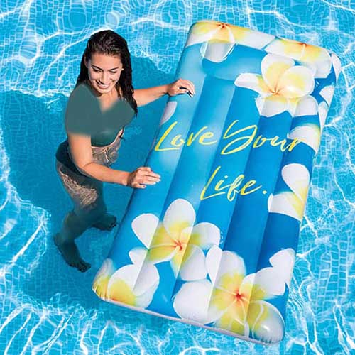 تشک بادی روی آب اینتکس گلدار intex 58772 یک تشک بادی روی آب با بدنه مواج و شیاردار می باشد که مزیت خوبی از این حیث به شمار رفته و باعث شده تا مشتریان بتوانند به بهترین شکل ممکن با در نظر گرفتن این ویژگی محصول را خریداری کرده و در فضای مد نظر از آن به بهترین شکل ممکن استفاده کرده و لذت ببرند. در همین رابطه شما می توانید مشاهده کنید که ظاهر اصلی این محصول با بهره گیری از رنگ آبی و با وجود گل های سفید رنگ شکل گرفته است که بسیار زیبا و ایده آل بوده و پس از قرار گرفتن روی آب جلوه ای خاص را در اختیار شما قرار می دهد. ناحیه بالایی این محصول نیز دارای یک بالش بادی سرخود می باشد که قطعا پس از دراز کشیدن بر روی این محصول از ناحیه سر و گردن می توانید به بهترین شکل ممکن به استراحت بپردازید.