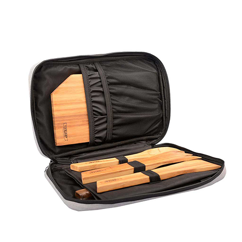 این ست شامل دو عدد چاقو آشپزخانه با کیفیت بسیار عالی می باشد. دسته های این چاقو ها از چوب راش مرغوب گرجستان است و تیغه هایی از جنس استیل دارد که بسیار تیز بوده و قابلیت خرد کردن انواع مواد غذایی را دارا می باشد. این ست دارای کفگیر، قاشق و چنگال چوبی بزرگ است که برای آشپزی مورد استفاده قرار می گیرد. به همراه این اقلام، یک تخته برش بسیار با کیفیت با ابعاد مناسب نیز موجود می باشد که کار شما را از هر حیث راحت تر می کند. تمامی این اقلام داخل یک کیف قرار دارد که وزن پایینی داشته و حمل و جابه جایی آن ها را آسان تر کرده است. وزن کلی این محصولات در حدود یک کیلوگرم می باشد که به دلیل وزن پایین، به راحتی در داخل کیف و کوله پشتی کمپینگ جای گرفته و به سادگی می توانید از آن استفاده نمایید.