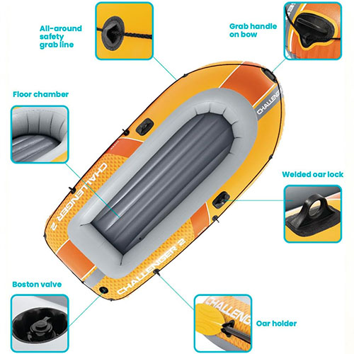قایق بادی مد نظر بدنه ای بادی و توخالی دارد که برای حمل آن می بایست باد داخل بدنه را به طور کلی خالی کرد و بدنه را تاشو کرد و حمل و جا به جا نمود. در چنین حالتی بدنه کوچک تر می شود و می تواند به صورت کمجا تر مورد حمل و جا به جایی قرار گیرد تا در مسافرت و گردش استفاده شود. در کنار این محصول پارو و پمپ باد ارائه می گردد که دیگر نیازی به تهیه لوازم جانبی وجود ندارد و می توان از وجود چنین محصولی استفاده کرد و لذت برد. قایق بادی مد نظر اهرم نگه داری پارو نیز دارد و دارای طناب نجات نیز می باشد که به صورت متصل به بدنه بوده است و می توان در زمان نیاز از آن بهره برداری کرد. کسانی که به دنبال انتخاب و خرید آسان قایق بادی چلنجر 2 اینتکس مدل challenger TM 66312 می باشند تنها می توانند با مراجعه به فروشگاه اصلی اینتکس ایران و بررسی مدل های مختلف قایق بادی نسبت به خرید این محصول اقدام نمایند.