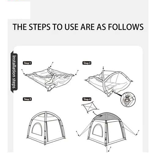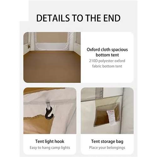 اقلام همراه | پمپ هوا (برای باد کردن سازه بادی) کیف حمل مقاوم میخها و طنابهای مهار برای تثبیت بیشتر دفترچه راهنما برای نصب و استفاده |