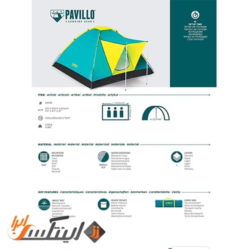 چادر مسافرتی عصایی با سایبان Bestway 68088 یکی از پر کاربرد ترین و پر استفاده ترین چادر های مسافرتی است که با قابلیت داشتن سازه های عصایی بسیار کاربردی خواهد بود. جنس بدنه پلی استر مقاوم نسبت به دما و بارش است که سازه های عصایی آن را در برگرفته اند. این چادر مسافرتی برای استفاده در تمامی فصول سال کاربرد دارد و دارای سازگاری می باشد. برای داشتن هوایی مطلوب در فصل تابستان می توان از بخش پشه بند محصول استفاده کرد و در داخل آن هوای آزاد را به گردش در آورد. در فصل بارش و سرما نیز بدنه به صورت عایق عمل می کند و می تواند از نفوذ آب و رطوبت به داخل خود جلوگیری نماید.