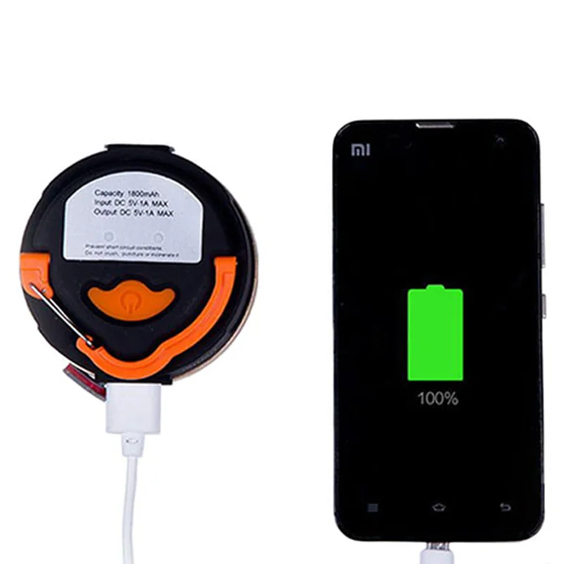 این محصول به صورت گرد طراحی شده است و ابعادی کوچک دارد. در قسمت بالایی آن یک آویز طراحی شده است که به راحتی از سقف چادر مسافرتی آویزان می شود. این محصول دارای یک باتری 1800 میلی آمپری است که توسط یک کابل شارژ شده و ساعت ها قابل استفاده است. از ویژگی های جذاب این چراغ شارژی قابلیت استفاده به عنوان پاور بانک برای گوشی های موبایل است. این محصول در حالت شارژ کامل قابلیت استفاده 3 تا 6 ساعت را دارد و نور مناسبی را در فضایی به قطر 10 الی 15 متر فراهم می کند.